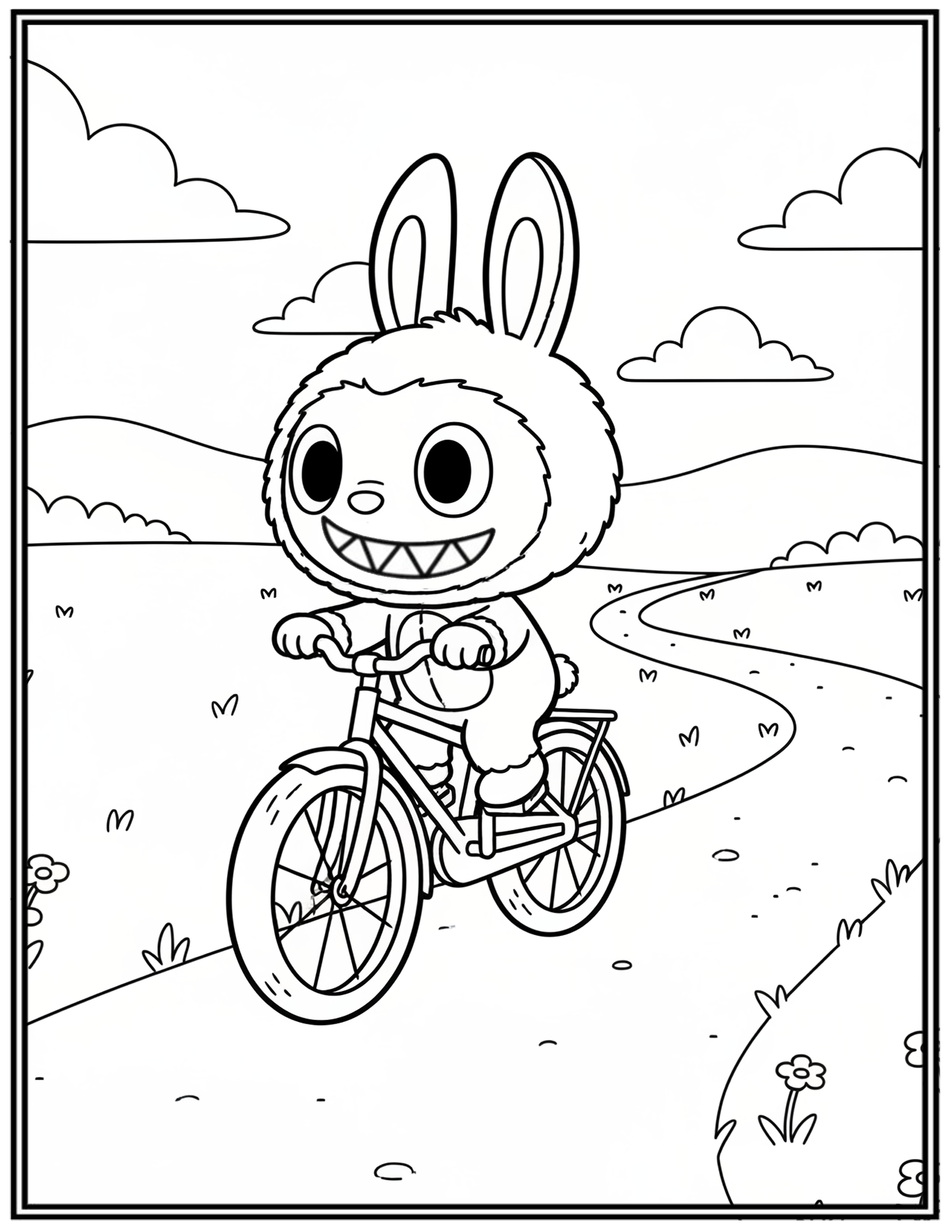 Countryside Path Labubu Riding Bike Coloring Pages