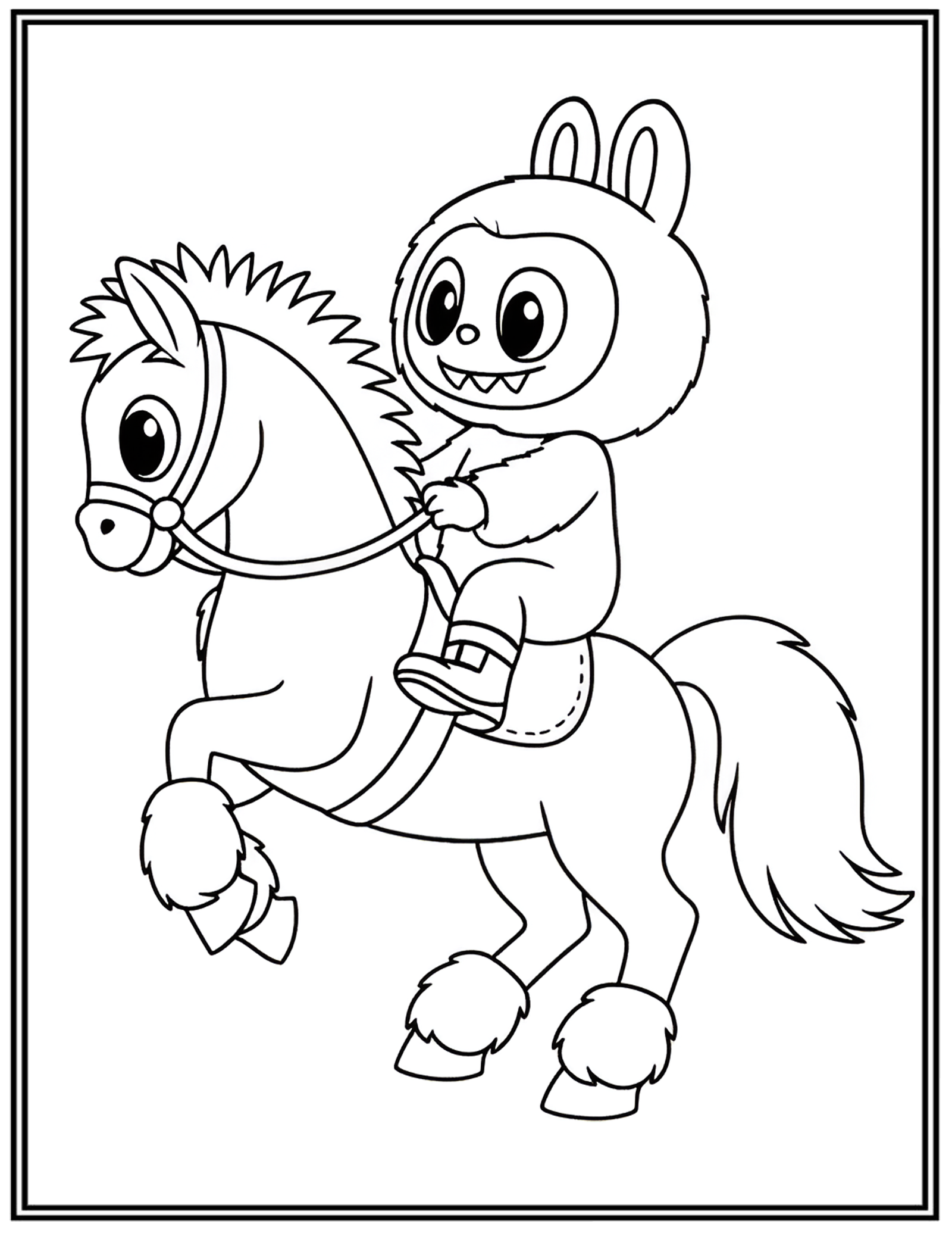 Labubu Happily Riding a Strong Horse Coloring Pages