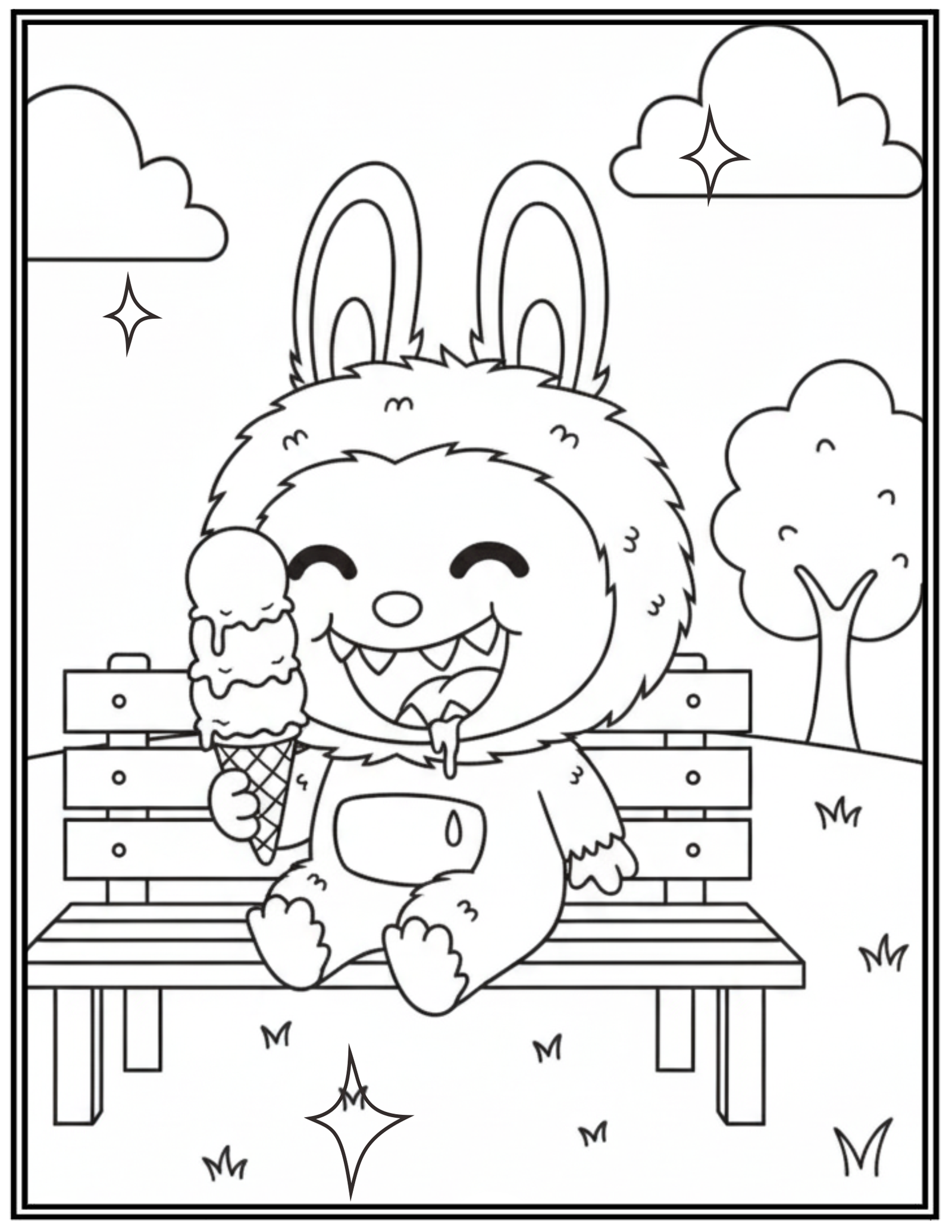 Labubu Enjoying a Triple Scoop Ice Cream Cone Coloring Pages
