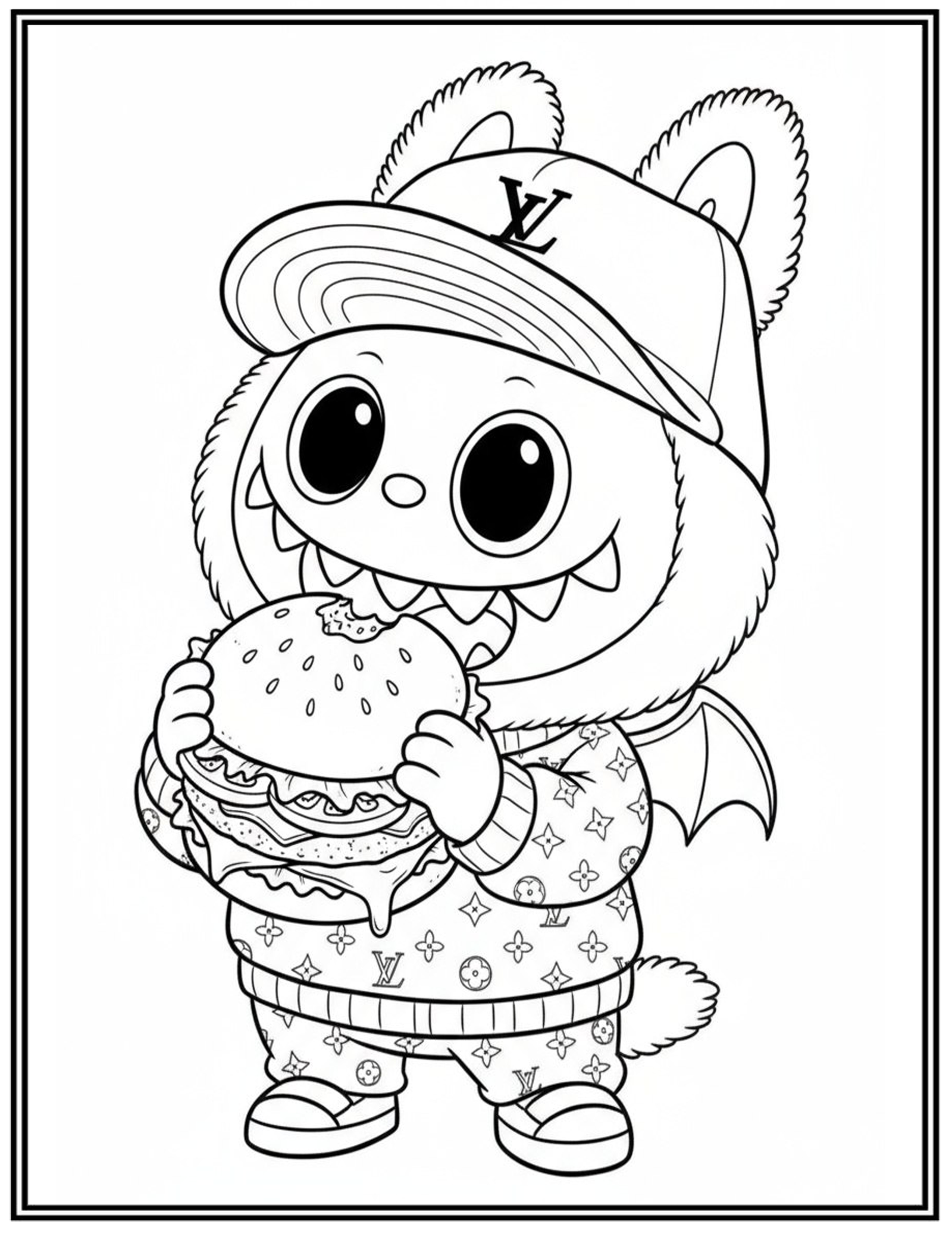 Labubu Happily Eating Delicious Burger Coloring Pages
