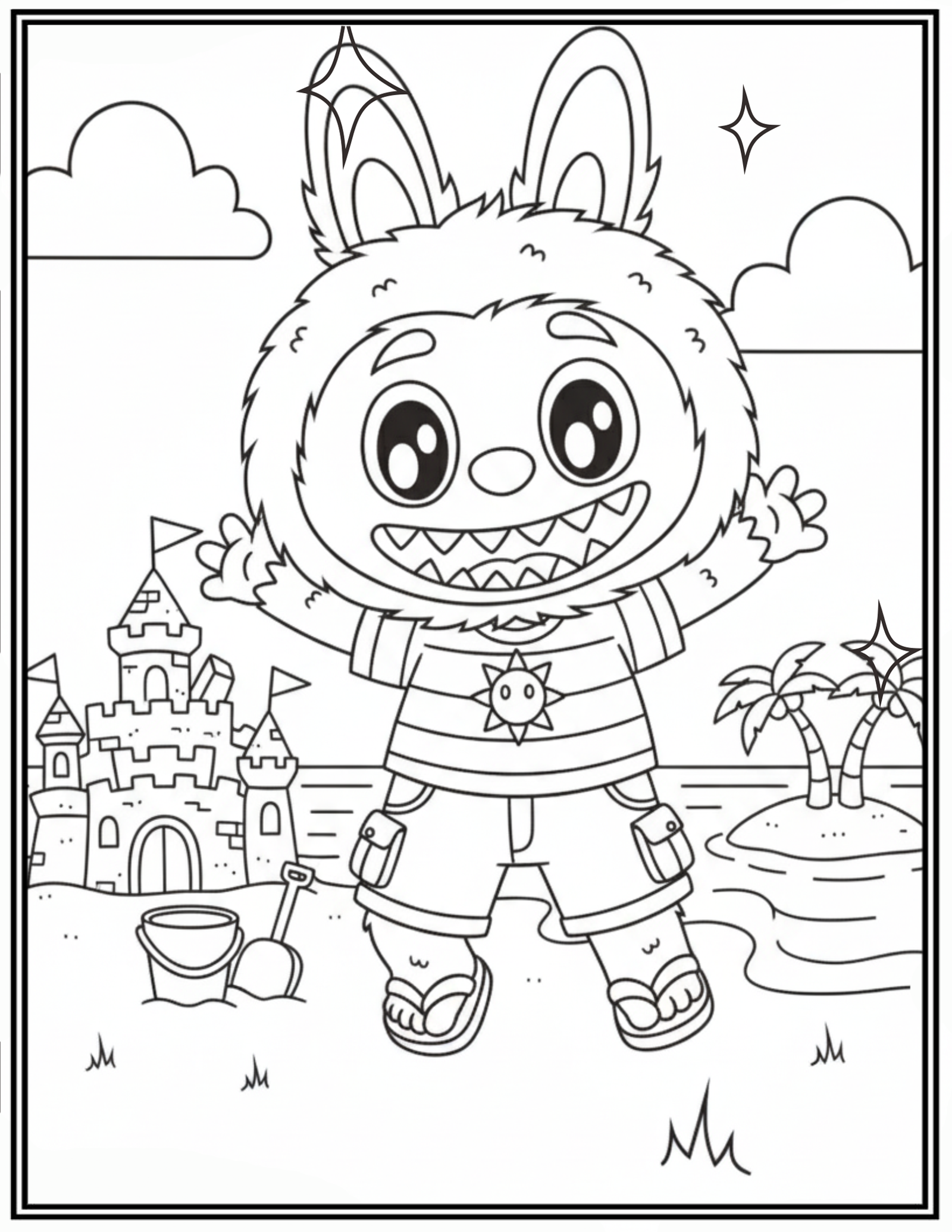 Labubu Happy A Sunny Day At the Beach Coloring Pages