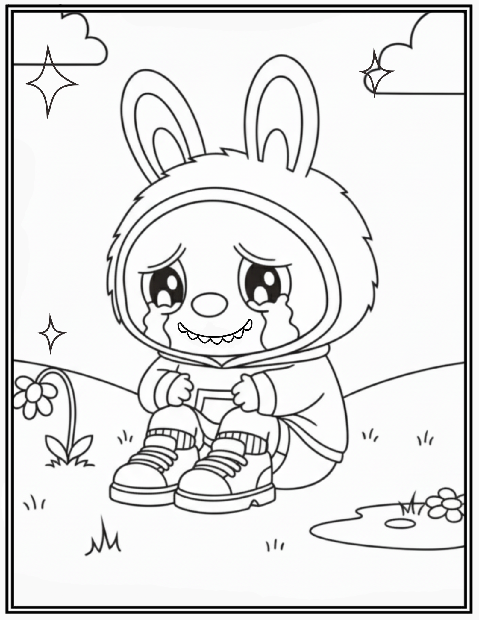 Labubu Sitting On The Grass Crying Sadly Coloring Pages