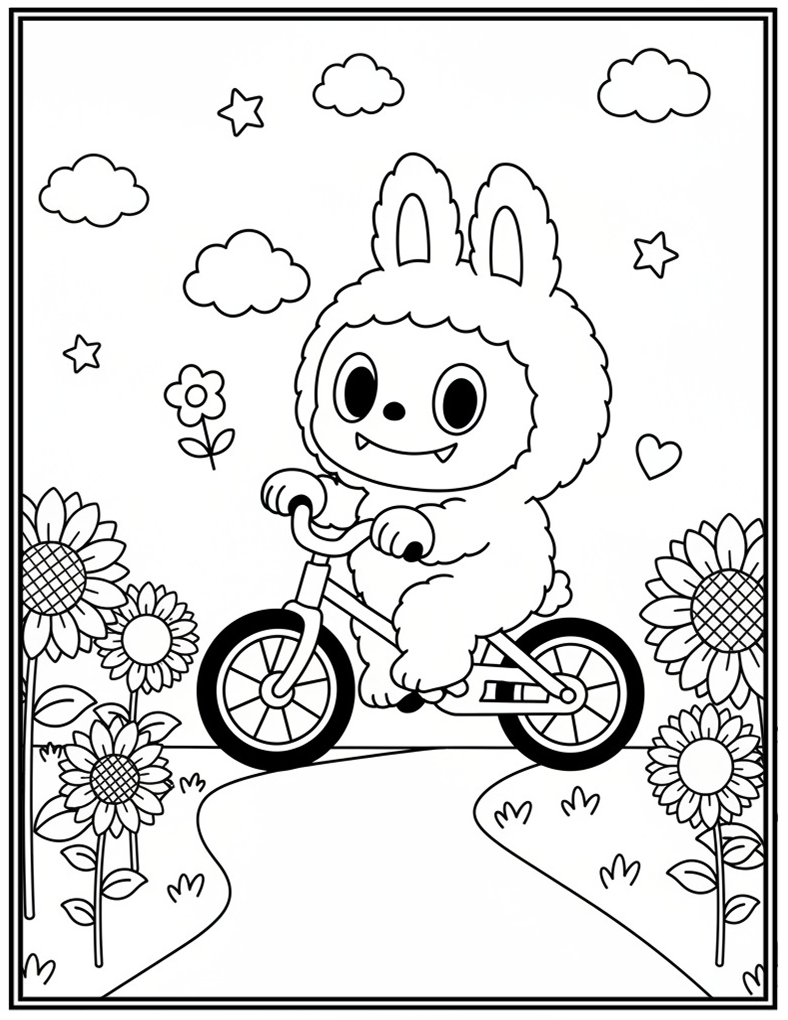 Nice Day Sunflowers Labubu Riding Bike Coloring Pages